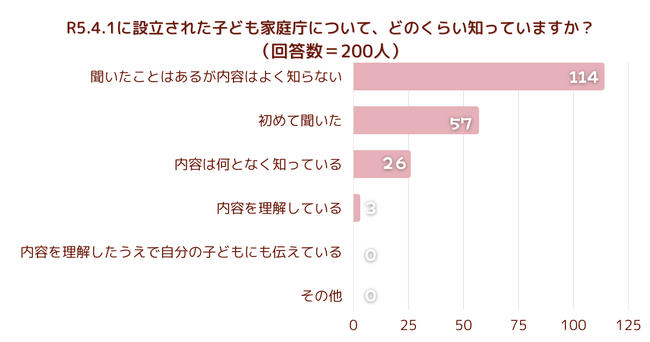 「R5.4.1に設立された子ども家庭庁について、どのくらい知っていますか?」とアンケート調査した結果、1位は『聞いたことはあるが内容はよく知らない』でした。
