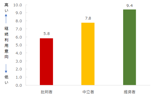 対象の代理店型自動車保険会社において、今後の継続利用意向を0~10の11段階でたずねたところ、 「推奨者」(推奨度が「9」~「10」の回答者) は平均9.4ポイント、 「中立者」(推奨度が「7」~「8」の回答者)は平均7.8ポイント、「批判者」(推奨度が「0」~「6」の回答者)は平均5.8ポイントとなり、推奨度が高いほど継続利用意向も高くなる結果となる結果となりました。