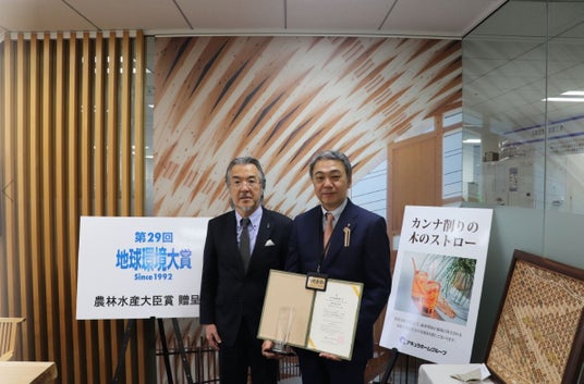 「木のストロー」は、2018年の西日本豪雨災害の一因として間伐が適切に行われていなかったことをきっかけに発案され、当社が間伐材(間引いた木で、細くて弱いため需要が少ない)を利用して世界で初めて開発・量産化したものです。日本の木造建築に使用される伝統技術「カンナ削り」によって、薄く削り出した「カンナ屑(削り華)」を斜めに巻き上げることで製作します。ものづくりの原点である「匠の心」を継承するため当社の伝統として19年続く「カンナ削り入社式」を体験した若手社員の柔軟な発想から誕生しました。この開発秘話は「木のストロー」(扶桑社刊)が出版され、2022年にはフジテレビでTVドラマ化されました。