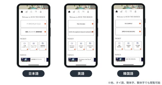 ハウステンボスの公式アプリを5言語(英語、韓国語、タイ語、簡体字、繁体字)に多言語化しています。