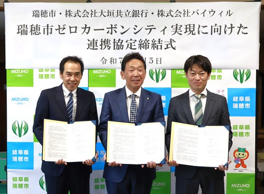 日本全国47都道府県のカーボンニュートラル実現を目指す株式会社バイウィル(本社:東京都中央区、代表取締役社長:下村 雄一郎、以下「バイウィル」)は、岐阜県瑞穂市(市長:森 和之、以下「瑞穂市」)、株式会社大垣共立銀行(本店:岐阜県大垣市、取締役頭取:林 敬治、以下「大垣共立銀行」)と、「瑞穂市ゼロカーボンシティ実現に向けた連携協定」を締結しました。