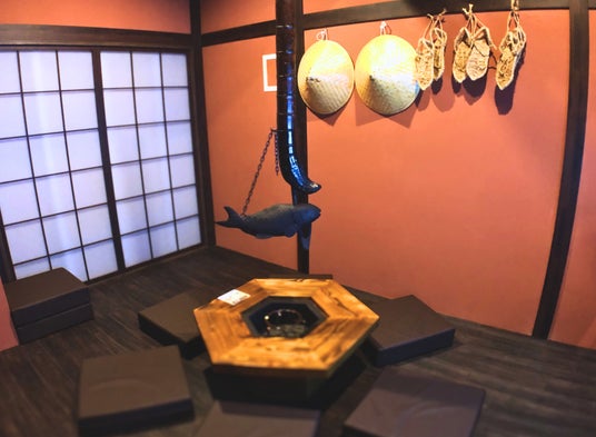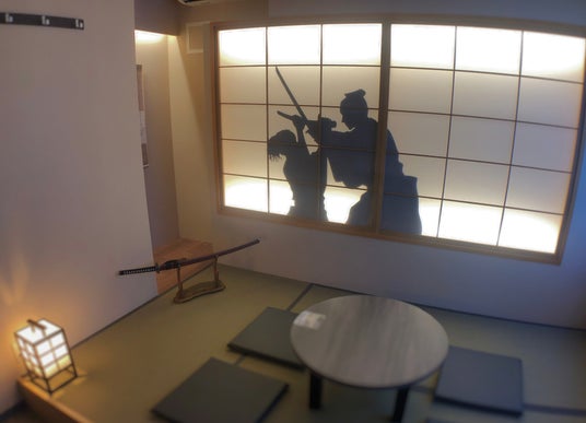 坂本龍馬と中岡慎太郎が暗殺された歴史的な「近江屋」をイメージしたこのルームでは、討ち入りを再現しており、刀や実際に飾られていた掛け軸のレプリカも設置しております。また、ルームのご利用でお抹茶とカステラをお召し上がりいただけます。