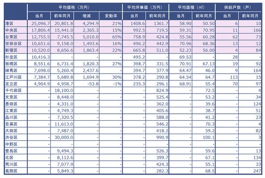 東京23区の各行政区毎に、平均価格、平均坪単価、平均面積、供給戸数をまとめました。当月の平均価格が大きい順に表示しています。