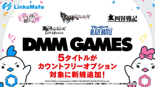 株式会社LogicLinks(以下LogicLinks、本社:東京都渋谷区、代表取締役社長:春田康一)は、MVNOサービス「LinksMate」において2025年1月16日(木)よりカウントフリーオプション対象コンテンツとして合同会社EXNOA(本社:東京都港区、CEO:村中 悠介)が提供するオンラインゲームプラットフォーム『DMM GAMES』にて配信中の「夢幻楼と眠れぬ蝶」、「エンバーストーリア」、「四界戦記」、「東京リベンジャーズ Last Mission」、「ブルーロック BLAZE BATTLE」を新たに追加することをお知らせいたします。