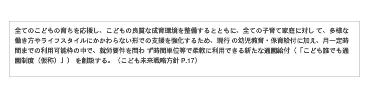 このたび、6月16日に閣議決定された『経済財政運営と改革の基本方針(骨太の方針)2023』に、私たちが提言してきた保育園の空き枠を利用して無園児の定期預かりを行う「こども誰でも通園制度(仮称)」が新たに盛り込まれたほか、仲間とともに提言してきた「こどものウェルビーイング指標」「男性育休の取得促進」が入りました。