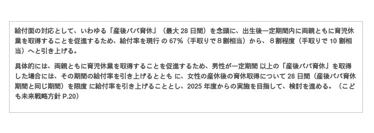 現在、「産後パパ育休」取得中には、賃金の67%の育休給付金を受け取ることができますが、これを80%に引き上げるとともに社会保険料の支払いも免除することで、実質的に賃金の10割を保障するということです。