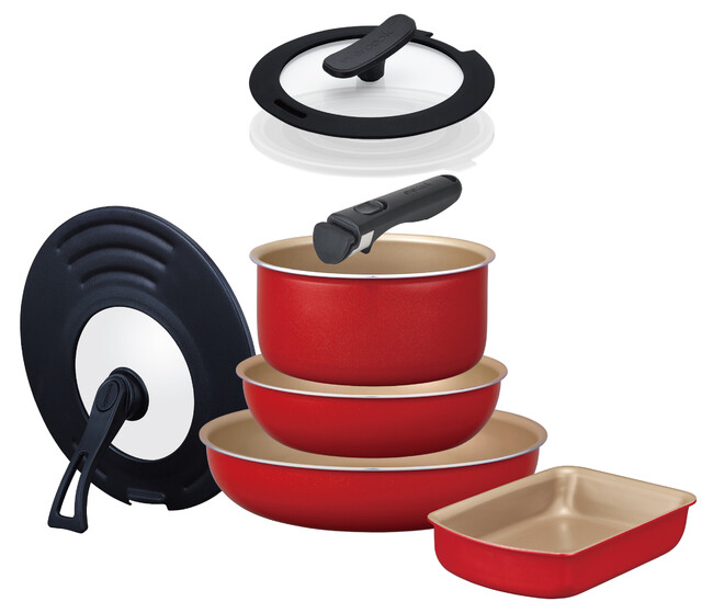 セット内容 : 1.専用ハンドル ミニ2.ポット用プラスチックふた18cm3.シリコーンリングつきガラスふた 18cm4.回転ハンドル立つ兼用カバー20~26cm5.玉子焼き13×19cm6.ポット18cm7.フライパン22cm8.フライパン26cm