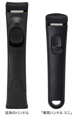従来のハンドルよりも、一回り小さく、軽くなったことから、「専用ハンドル ミニ」という名称がついています。ハンドルが軽くなったことにより、従来のハンドルの重さでは、バランスが悪くなり使用できなかった小さなサイズのフライパンにも取り付けができるようになりました。「専用ハンドル ミニ」では、新たに20cmのフライパンと13×19cmの玉子焼きフライパンに対応できます。もちろん、「選べるevercook」シリーズの全てのフライパン・鍋にも対応しています。