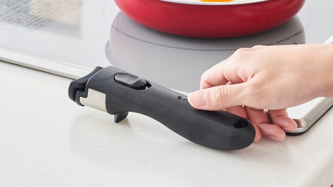 ハンドル裏側のロックレバーに突起をつけることで、ハンドルを置く際に、横に転がらずしっかりと置くことができます。また、フライパンとの設置部が置いた場所から浮くデザインになっているため、調理中に取り外しても、ハンドルに付着した調理物で置いた場所を汚すことがありません。
