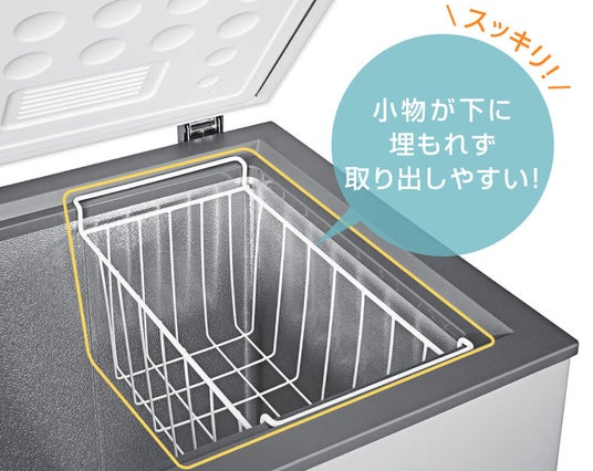 ワイヤーバスケットを付属しており、小物(個包装の冷凍食品など)を整理整頓して保存することができ、スムーズに取り出すことができます。