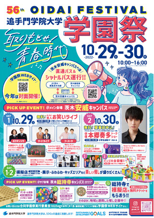 追手門学院大学(略称:追大、大阪府茨木市、学長:真銅正宏)は、3年ぶりとなる対面形式での学園祭を、茨木安威キャンパスをメイン会場に10月29日(土)と30日(日)の2日間、開催します。