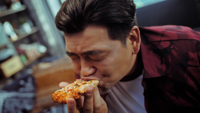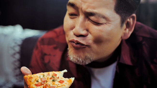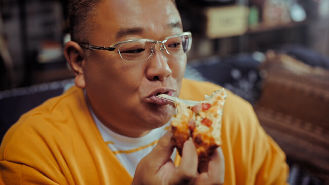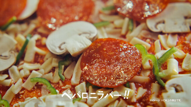今回は人気メニューの「テリヤキチキン」、「マルゲリータ」、「ペパロニラバー」に加え、熟成パンチェッタと瀬戸内レモンソースが相性抜群の新作「熟成パンチェッタと瀬戸内レモンソース」が一枚になった『熟成パンチェッタのよくばりクォーター』が新登場!美味しそうな調理工程も交えながら、豪快な食べっぷりでその魅力を伝える二人。あまりの美味しさにピザで頭がいっぱいになる伊達さんと、そんな伊達さんで頭がいっぱいになる富澤さんの仲睦まじいシーンもお見逃しなく。