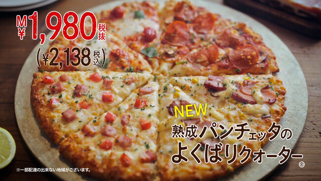 この夏新登場!イチキュッパ(Mサイズ税抜1,980円)の『熟成パンチェッタのよくばりクォーター』は、丁寧に低温で加熱した熟成パンチェッタとさわやかに香る特製瀬戸内レモンソースが相性抜群の新作「熟成パンチェッタと瀬戸内レモンソース」、定番メニューで常に人気の「テリヤキチキン」と「マルゲリータ」、熟成サラミの旨みとパルメザンチーズのコクが味わえる「ペパロニラバー」の、ピザーラが誇るバリエーション豊かな4種が1枚に集結したクォーターピザです。