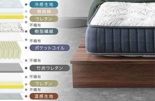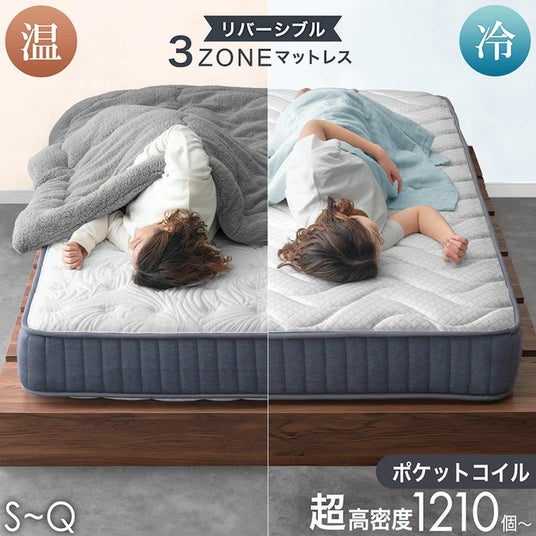 本製品は、1つのマットレスで「温感面」と「冷感面」の2種類の寝心地をご体感いただく事ができ、季節や気温に応じてオールシーズン快適にお使いいただけます。また、肌触りだけでなく、体圧分散性に優れた超高密度ポケットコイルを使用しており、腰回りをしっかりサポートする3ゾーン構造を採用するなど、寝姿勢をしっかり支えるサポート性能にも優れています。