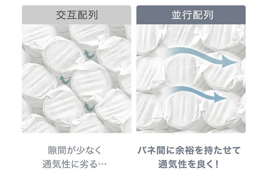 また、一般的なポケットコイルマットレスは1つ1つのコイルが不織布で包まれているため通気性が悪くなりやすいですが、本製品はコイル間に余裕を持たせて通気性を高めている並行配列を採用することで高い通気性を持ち合わせています。