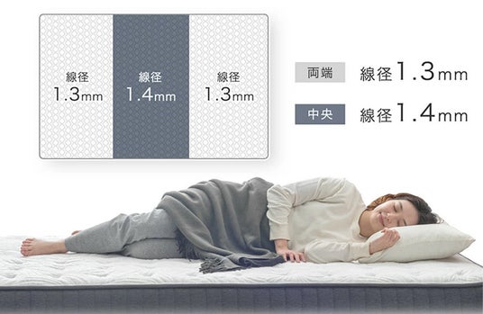 3ゾーン構造とは、マットレスを3つの異なるエリアに分けて、それぞれに異なる硬さやサポート力を持たせる設計のことです。本製品は重い腰回りの部分に線径の太いコイルを使い、体重がかからない頭や足元は比較的柔らかいコイルを使用します。体の各部位に合わせて適切なサポート力を持つコイルを配置することで正しい寝姿勢を保ちやすくより快適な睡眠をサポートします。