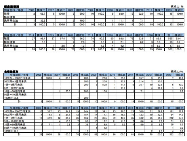 「倒産態様別」は、「破産」が71件(構成比89.9%)、「民事再生法」が5件(同6.3%)、「特別清算」が3件(同3.8%)
