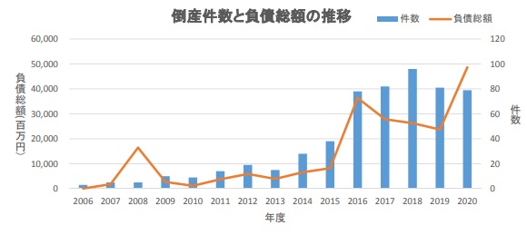 太陽光関連業者の2020年度(2020年4月~2021年3月)の倒産件数は2年連続で減少した。もっとも、年度末にかけて大型倒産が発生しており、動向には十分な注意が必要だ。