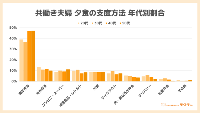 ■40~50代は妻が作る世帯が多い 30代はテイクアウト、デリバリーに頼る割合が増える