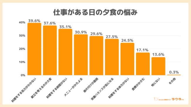 夫婦共働きと回答した1,443人に、「ご夫婦ともに仕事のある日の夕食に関して、どのような悩みがありますか?(複数回答可)」を尋ねたところ、お悩みのTOP3は「料理をする気力がわかない」39.6%、「献立を考えるのが大変」37.6%、「料理をする時間がない」35.1%。