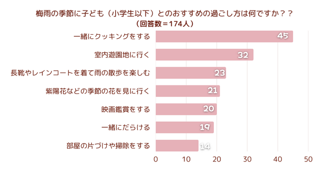「梅雨の季節に子ども(小学生以下)とのおすすめの過ごし方は何ですか?」とアンケート調査した結果、1位は『一緒にクッキングをする』でした。