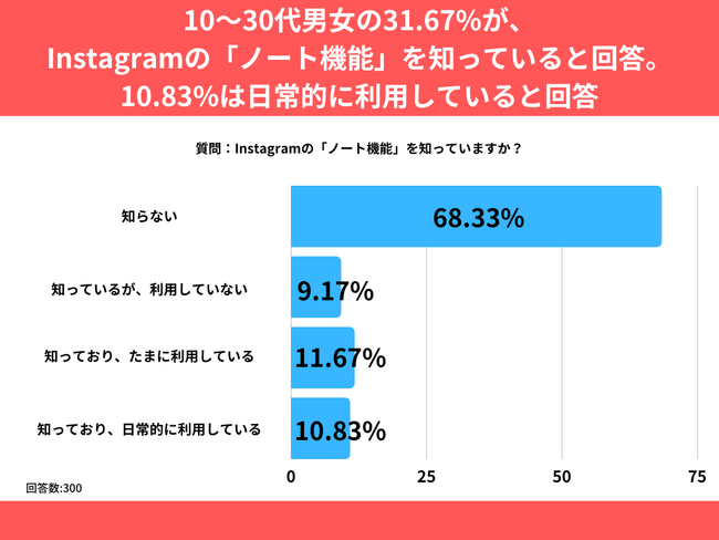 10~30代男女を対象とした「Instagramの「ノート機能」を知っていますか?」というアンケートで最も多かった回答は「知らない」で68.33%でした。