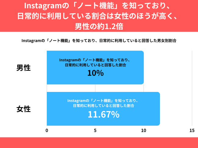 Instagramの「ノート機能」を知っており、日常的に利用していると回答した割合を男女別でみてみますと、女性が11.67%、男性が10%という結果になりました。