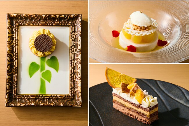 パイナップルやココナッツの果実の甘味に、レモンソースの爽やかな酸味が際立つ「クラスペディア」や、チョコレートとヘーゼルナッツを中心に、さっぱりとしたオレンジ、甘味と塩味を感じる塩キャラメルクリーム、アーモンドの風味が豊かなショコラジョコンドなどの幾重にも重ねられた層が絶妙なハーモニーを織りなす「オランジュノワゼット」、真夏に咲き誇る“ひまわり”をイメージし、マンゴーやパッションフルーツなどの南国フルーツでトロピカルな甘味に仕上げた「タルトソレイユ」の3種の新スイーツをラインアップ。