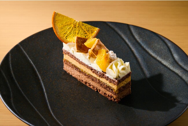 アーモンドの豊かな風味としっとりとした食感を楽しめるショコラジョコンド、ショコラの味を引き立たせるジャンドゥーヤムース、オレンジの皮を千切りにし、爽やかな風味を引き出したオレンジジュリエンヌジャム、甘さの中に塩味のアクセントを感じる塩キャラメルクリーム、そして軽く滑らかな口当たりのオレンジのガナッシュモンテが層をなしており、甘味と酸味、そして塩味が順番に口の中で広がります。
