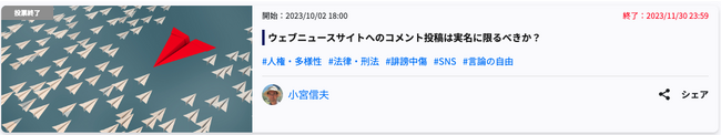 SNSとテクノロジーで社会課題の発見・解決をサポートするPolimill株式会社(ポリミル、本社:東京都港区、代表取締役:横田えり、以下Polimill社)はこのたび、「ウェブニュースサイトへのコメント投稿は実名に限るべきか?」というイシュー(課題)について11月30日に投票が終了しましたので結果をお知らせします。