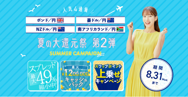 今般、2022年8月1日より、ポンド/円、豪ドル/円、NZドル/円、南アフリカランド/円を対象とする3つのキャンペーンからなる『人気4通貨 夏の大還元祭 第2弾』を開始いたします。