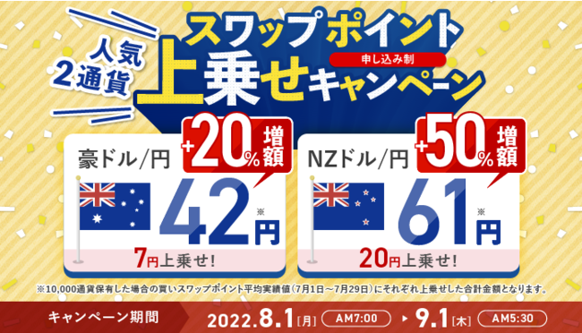 上乗せ分は、豪ドル/円(AUD/JPY)はキャンペーン期間内の受取りスワップ合計の「20%」、ニュージーランドドル(NZD/JPY)は「50%」です。