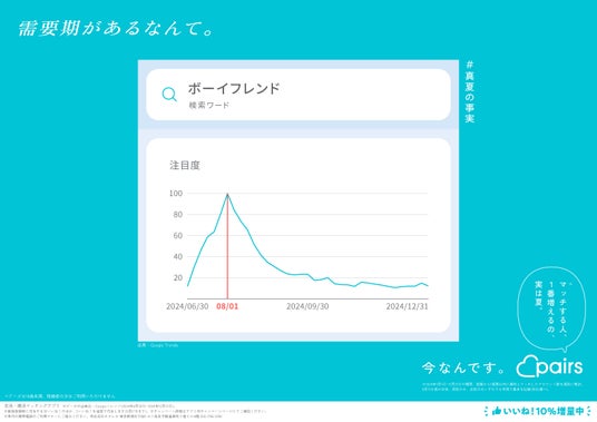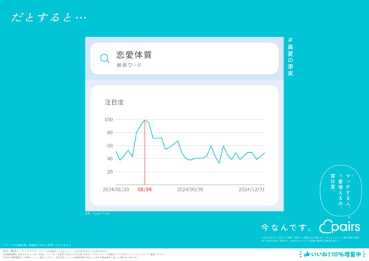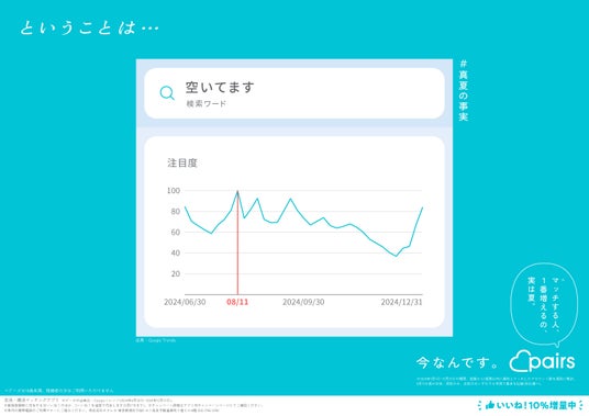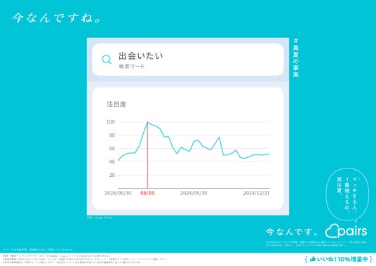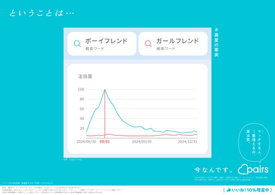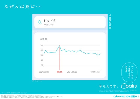 恋活・婚活マッチングアプリ「Pairs(ペアーズ)」を運営する株式会社エウレカ(本社:東京都港区、代表取締役CEO:山本竜馬、以下 ペアーズ)は、Web検索のトレンドデータ※1に基づいた恋愛にまつわる“意外な事実”を取りまとめた「#真夏の事実」キャンペーンを開始します。同キャンペーンでは、2025年8月4日(月)から東京メトロ銀座線、丸ノ内線、日比谷線 ドア横ポスターや、JR東日本 首都圏各線中づり等で広告掲載を順次開始します。またXでは「夏恋大喜利キャンペーン」を同日から14日間に渡り開催し、優秀回答者等140名様にAmazonギフトカードを最大1万円分進呈します。その他、ペアーズのアプリ内で新規登録時に付与される「いいね!」の数を期間限定で10%増量します。