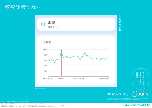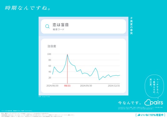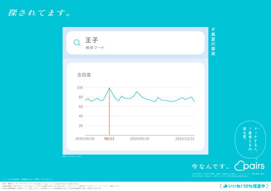 ペアーズはこの夏、恋愛にまつわるさまざまなキーワードをWeb検索のトレンドデータを独自に調査・収集し、#真夏の事実として恋愛にまつわる“意外な事実”をまとめました※2。事実の一つ、検索ワード「王子」は2024年1月1日から12月31日の1年間のうち、8月11日に最も検索されたという#真夏の事実が存在します。また、恋愛の王道キーワード「出会いたい」は8月5日、少しセンチメンタルな「恋は盲目」は8月11日、運命を感じる「ドキドキ」は8月18日等、全9件の“恋愛にまつわるキーワード”が、夏本番の8月に検索されていることを明らかにしました。ペアーズはこれらの#真夏の事実を元に、恋活・婚活に最適な季節が真夏の「今」であることを広告掲載やXキャンペーンで発信します。