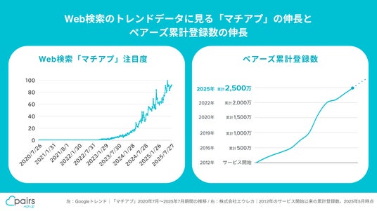 Web検索トレンドデータではもう一つ、恋愛にまつわる面白い実態が浮かび上がりました。いわゆる「アフターコロナ」が始まった2022年後半から、マッチングアプリの略語である「マチアプ」が2025年の現在に至るまで右肩上がりの増加を続けています※3。ペアーズは2012年のサービス開始以来、日本の恋活・婚活マッチングアプリとして独身男女の出会いの機会創出に貢献しており、2019年には累計登録数1000万を突破。“マチアプ”が検索され始めた2022年からの3年間でも、500万増の累計登録数2500万を突破しています※4。より簡潔にその存在を伝える略語の“マチアプ”が浸透しつつあるこの実情は、マッチングアプリのさらなる一般化を示しており、ペアーズは今後も、数多くのかけがえのない出会いを創出してまいります。