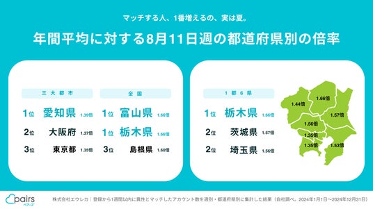 同じく、年間の週次平均マッチアカウント数に対する2024年8月11日週の倍率を47都道府県別に調査しました※6。はじめに三大都市圏で比較すると、愛知県が1.39倍で1位、大阪府が1.37倍で2位、東京都が1.35倍で3位と、いずれも男女合計の全体平均である1.39倍以下にとどまりました。一方の47都道府県TOP3は、1.66倍の1位が富山県と栃木県、1.60倍の3位が島根県となり、都心部からやや離れた地域が大きな伸びを示しました。