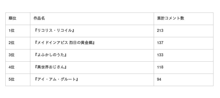 また、夏アニメ放送期間中のエピソードコメント数の上位5作品を中間結果として発表します。