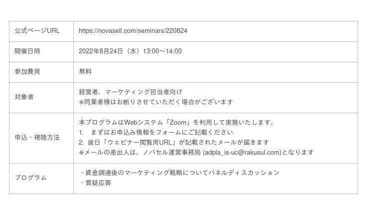 運用型テレビCMサービスを中心に「マーケティングプラットフォーム」を運営する、ラクスルグループのノバセル株式会社(本社:東京都品川区、代表取締役社長:田部正樹、以下ノバセル)は、8月24日(水)13時より、経営者、マーケティング担当者向けオンラインセミナー「業界NO.1事業を作る 資金調達後のマーケティング最前線」を開催いたします。