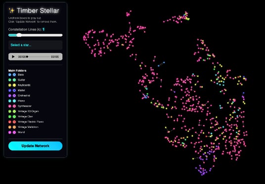これにより、従来のように個別に試聴しながら音を探すのではなく、関係性を俯瞰しながら目的の音や類似した音へと効率的にたどり着くことが可能になります。さらに、カテゴリ情報を保持しながらも、それに縛られない横断的な探索を可能にしており、ジャンルを越えた新たな音の組み合わせや発見を促します。