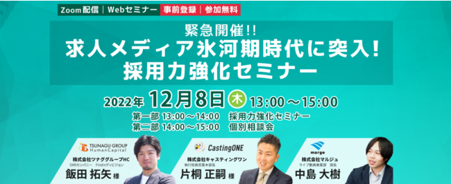 本セミナーでは、DXリクルーティングを用いた採用支援を行うツナググループHC、SOKUMEN、ITSUMENなどWEB面接システムの開発運営を行っている株式会社マルジュ、派遣会社様の売上/利益の向上と業務効率化を実現するクラウド型の派遣支援サービスの開発運営を行っている株式会社CastingONEの3社により、求人メディアに頼らない採用力強化の具体事例をご案内いたします。