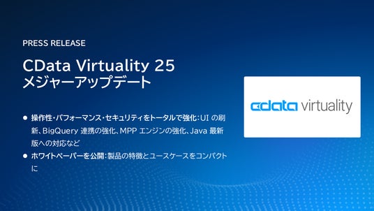 CData Software Japan 合同会社(本社:米国ノースカロライナ州、日本オフィス:宮城県仙台市、代表社員 職務執行者:疋田 圭介、以下 CData)は5月14日、データ仮想化プラットフォーム『CData Virtuality』のメジャーアップデートCData Virtuality 25 をリリースしました。今回のアップデートでは、Web UI の刷新や超並列処理(MPP)エンジンの強化、Google BigQuery 連携の改善、Java 17 LTS 対応など、操作性・パフォーマンス・セキュリティなど製品の全面的な強化を実施しています。また、本リリースと同時にホワイトペーパー『「仮想化 × ETL」で広がるデータ活用の可能性― CData Virtuality が実現するユースケース集』を公開しました。本ホワイトペーパーでは、仮想化とETL(レプリケーション)を両面で実現するCData Virtuality の特徴や、本製品が実現する多様なユースケースを紹介しています。CData Virtuality に関心を持っていただいた方に、まずご覧いただきたい資料です。
