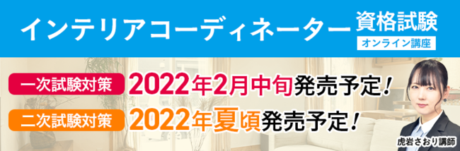 アガルートアカデミーでは<一次試験対策>2022年2月中旬・<二次試験対策>2022年夏頃にインテリアコーディネーター資格試験オンライン講座の販売を開始いたします。