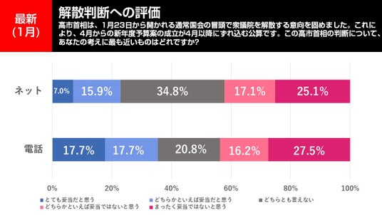 今回の調査は高市総理による解散の正式表明(19日)の前でしたが、電話調査とネット調査ともに「妥当ではない(まったく妥当ではない、どちらかといえば妥当ではない)」が「妥当(とても妥当だと思う、どちらかといえば妥当だと思う)」を上回りました。