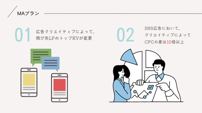 『マーケティングオートメーションプラン(MAプラン)』は広告クリエイティブによって、飛び先LPのトップKVが変わる! 安く作れてCVが残りやすい設計にする、 プラコレのHP制作&マーケティングサービスとなっております。