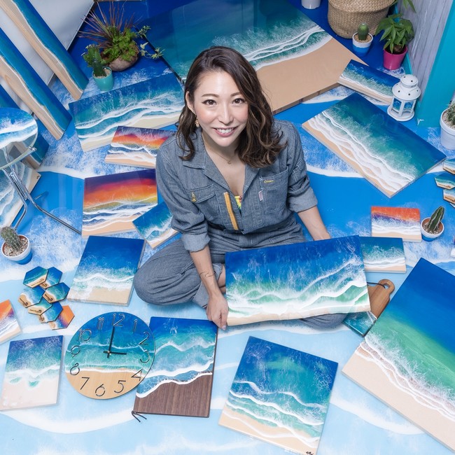 色を混ぜ合わせた液体状のエポキシレジン(樹脂)を使うレジンアート。流し込んだ樹脂に風やヒートガンをあて、グラデーションやシュワシュワの海の波を表現します。レジンの硬化には24時間かかり、何層にも重ねることで立体的で奥行きのある作品を創り出します。