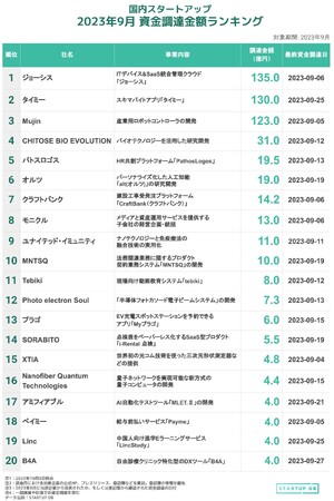 成長産業支援事業を推進するフォースタートアップス株式会社(本社:東京都港区、代表取締役社長:志水雄一郎 以下、フォースタートアップス)は、継続的に国内スタートアップ動向に関する調査を行い、当社サービスである「STARTUP DB(スタートアップデータベース)」に調査結果を公開しています。今回は、2023年9月に発表された「国内スタートアップ資金調達金額ランキング(2023年9月)」を発表いたします。