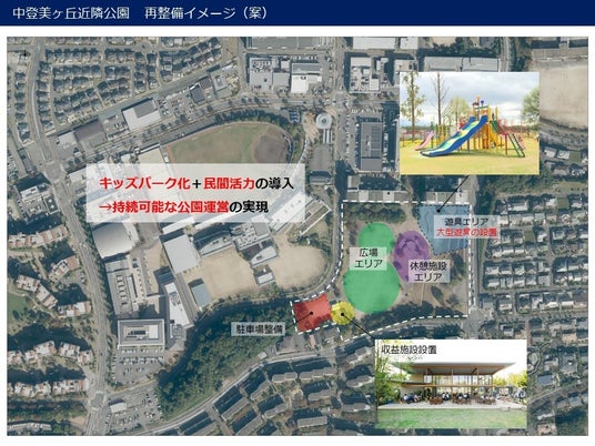 - 中登美ケ丘近隣公園と黒谷公園において、Park-PFI(公募設置管理制度)等の民間活力の導入を検討するため、市場調査・意見交換を行います。