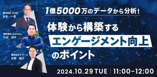 人的資本/ウェルビーイング経営支援の株式会社ラフール(本社:東京都中央区、代表取締役社長:結木啓太 以下「ラフール」)は、「1億5000万のデータから分析!体験から構築するエンゲージメント向上のポイント」をテーマとしたセミナーを、2024年10月29日(火)に株式会社IKUSA社・株式会社otonoha社と共催で行います。
