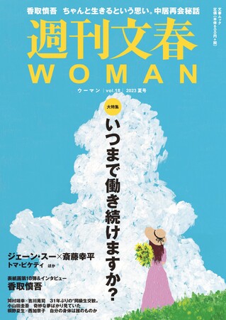 大特集は、男女雇用機会均等法第一世代が今年度、60歳の定年を迎えることを踏まえて「いつまで働きつづけますか?」。表紙を飾るのは、香取慎吾さんが本特集のために描いた「令和五年、夏 入道雲と向日葵と麦藁帽子」です。