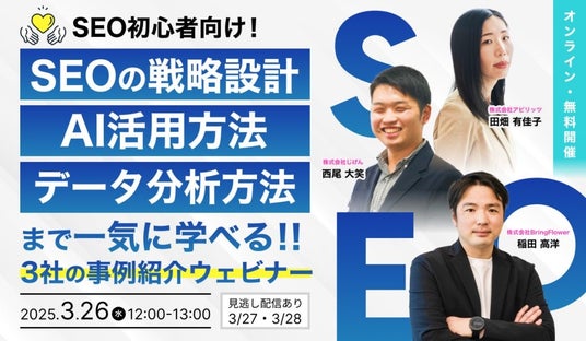 株式会社アピリッツ(本社:東京都渋谷区、代表取締役社長執行役員CEO:和田 順児)は、株式会社じげん(本社:東京都港区、CEO:平尾 丈)および株式会社BringFlower(本社:東京都新宿区、代表取締役:稲田 高洋)と無料オンラインセミナー「SEO初心者向け!SEOの戦略設計~AI活用方法~データ分析方法まで一気に学べる!3社の事例紹介ウェビナー」を、2025年3月26日(水)12:00より開催いたします。